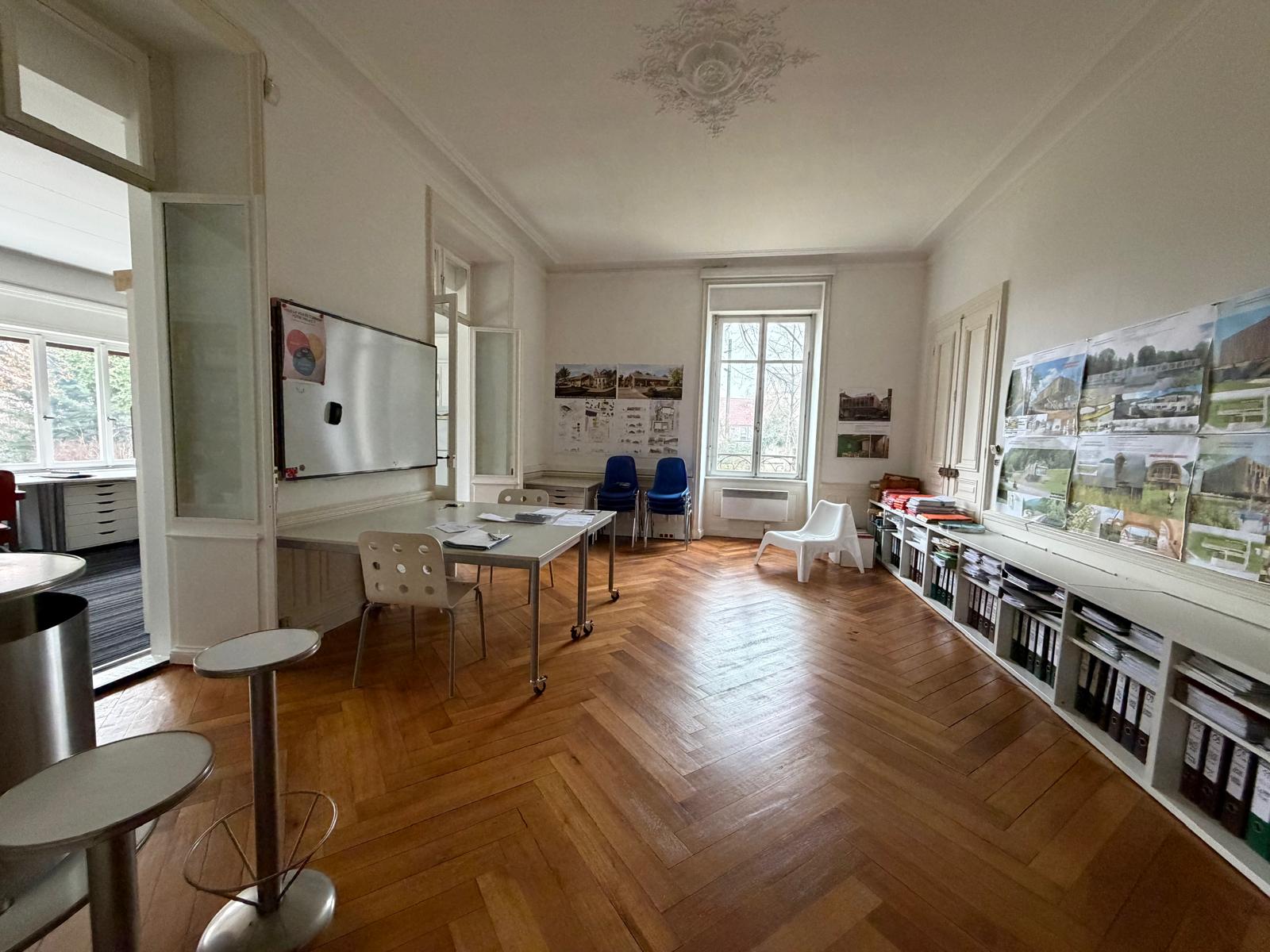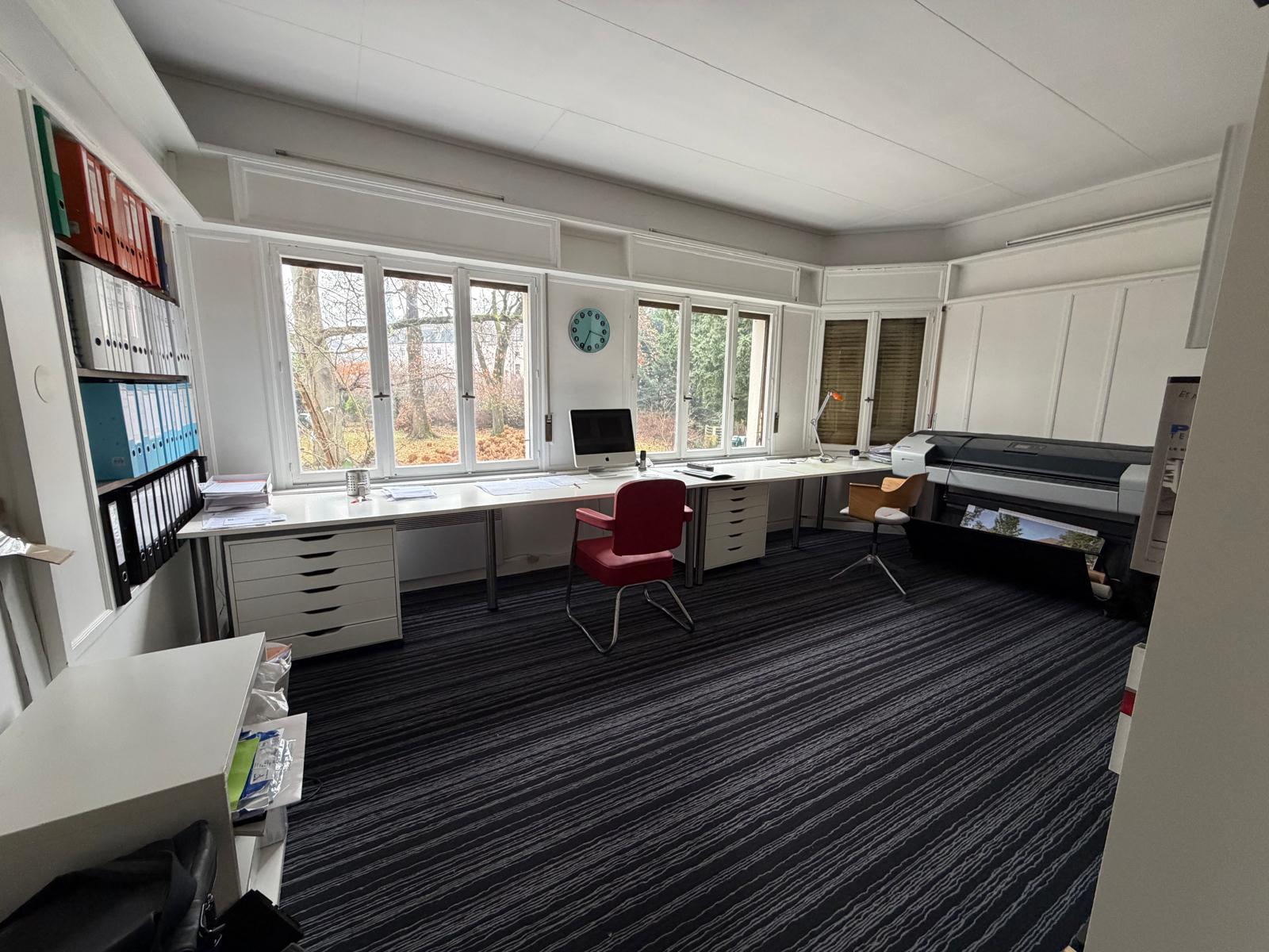 Au rez-de-chaussée : Un espace professionnel fonctionnel comprenant 6 grands bureaux, un coin cuisine, ainsi que des WC séparés.