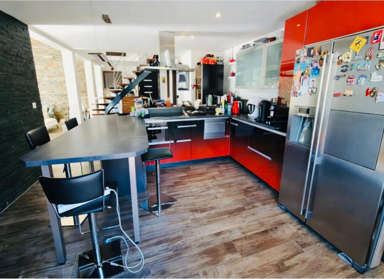 Dès l’entrée, le ton est donné : une architecture moderne sublimée par un toit cathédrale et un vaste espace de réception baigné de lumière naturelle. La pièce de vie, aux volumes ouverts, s’articule autour d’une cuisine intégrée haut de gamme, pensée pour conjuguer esthétisme et convivialité.