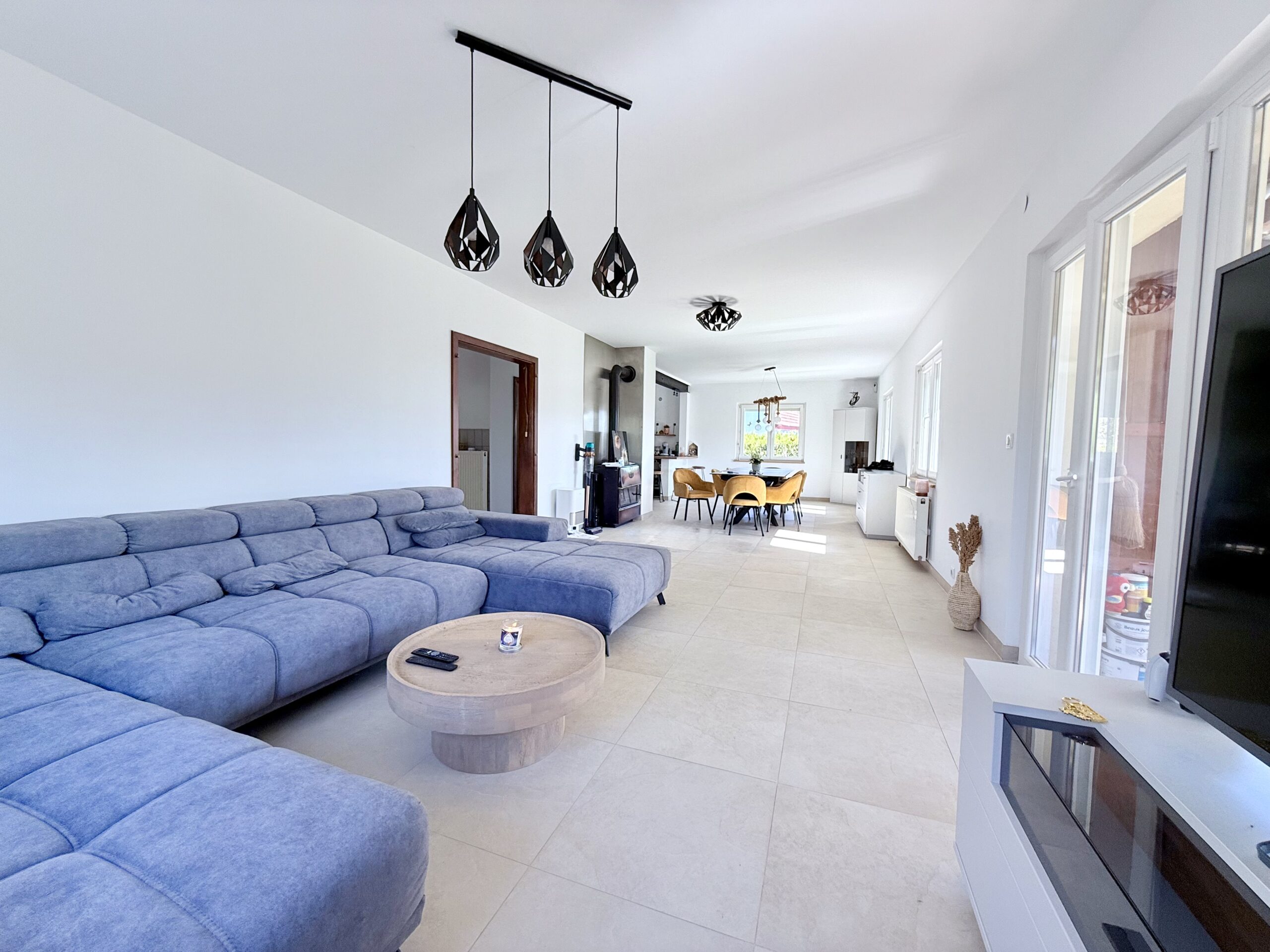 Elle se compose, au rez-de-chaussée, d’une entrée donnant accès à un vaste salon-séjour lumineux avec accès direct à la terrasse, idéal pour les moments de détente et de convivialité. La cuisine ouverte, entièrement équipée, complète harmonieusement l’espace de vie. Une chambre actuellement utilisé en salon de coiffure, ainsi qu’une salle de bains avec WC, permettent une vie de plain-pied appréciable.